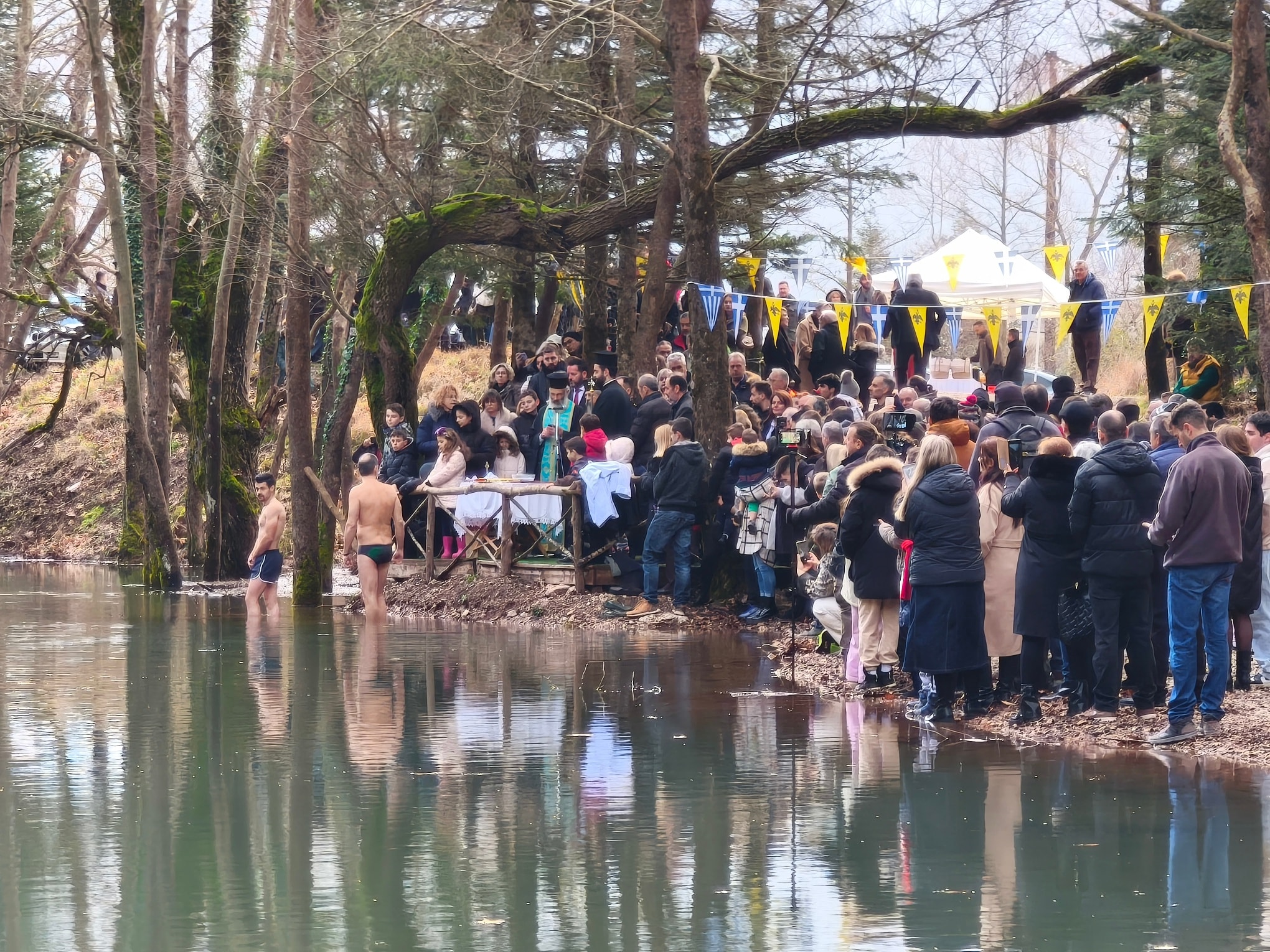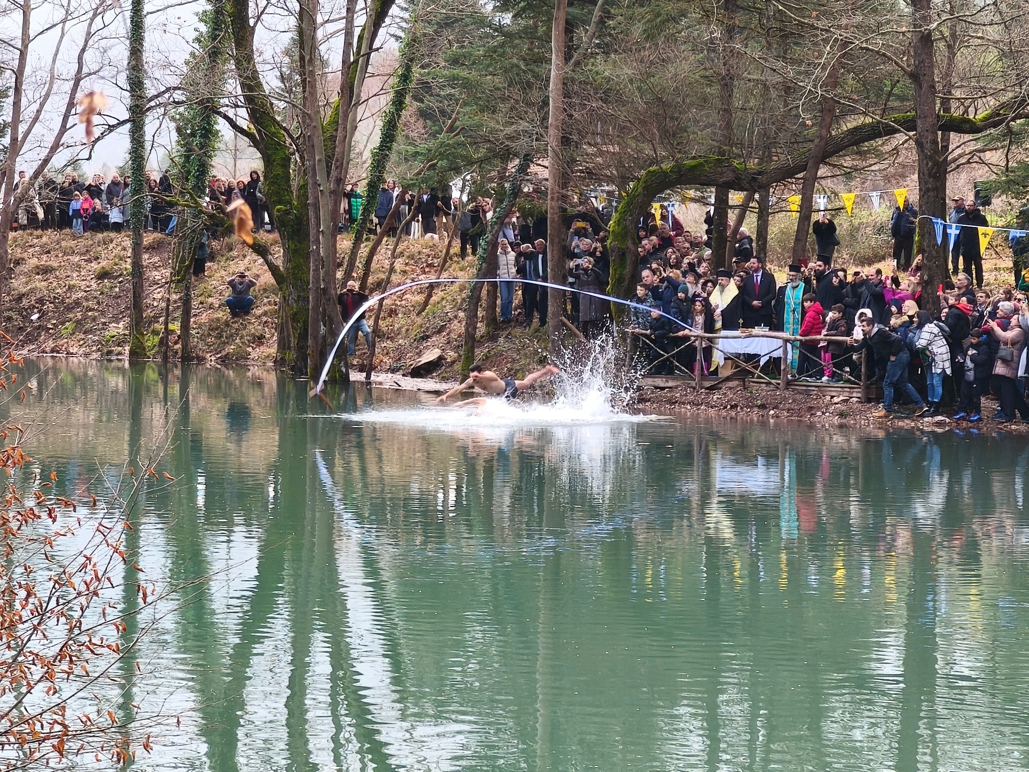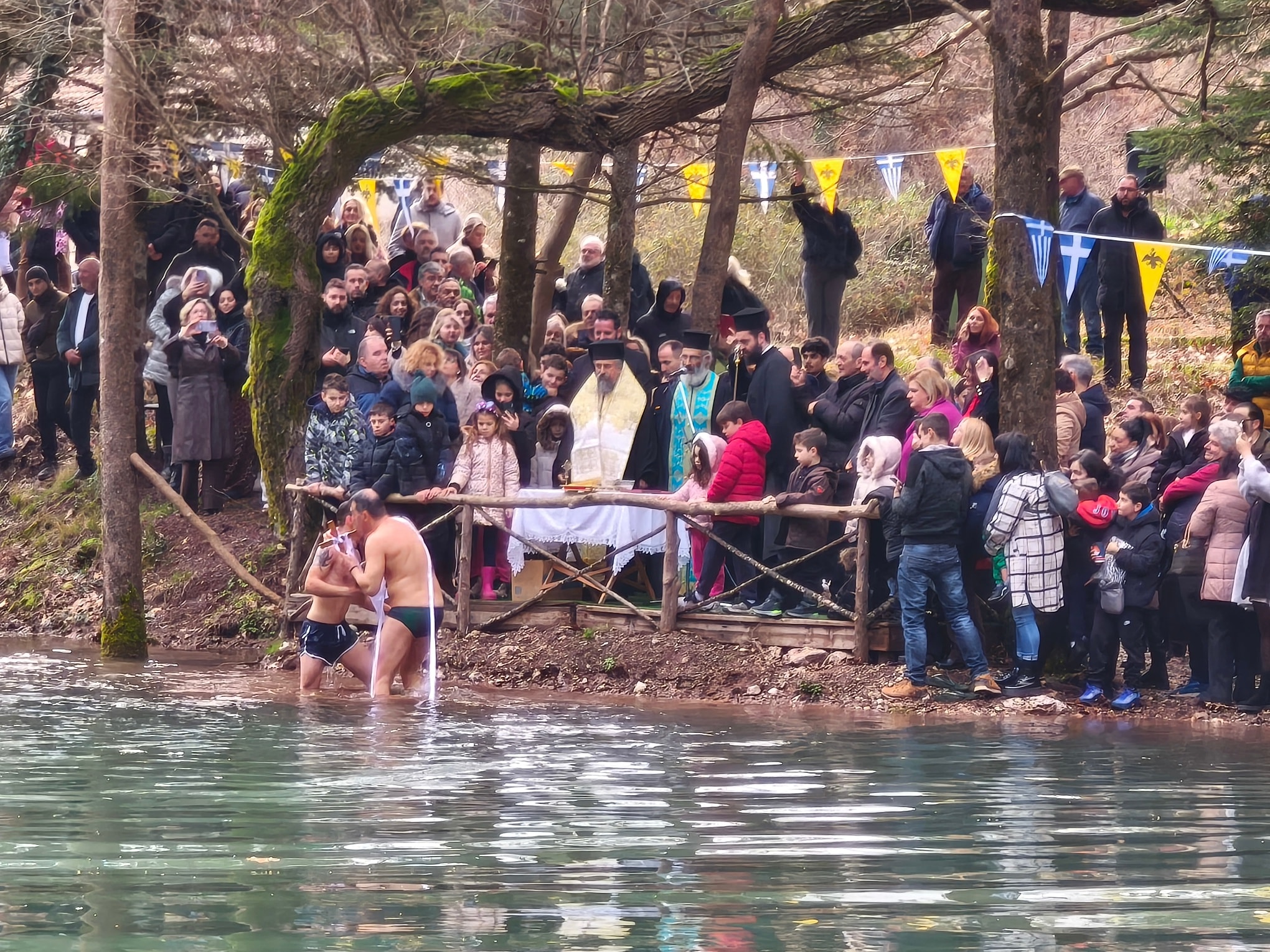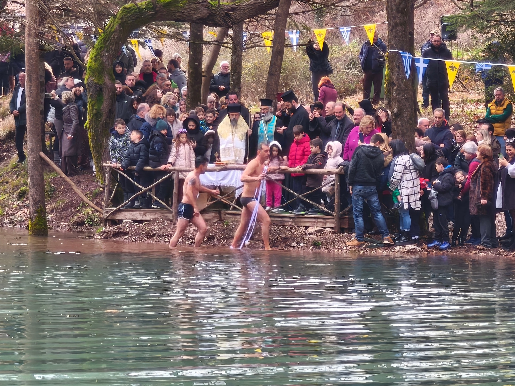 Η τελετή κατάδυσης του Τιμίου Σταυρού πραγματοποιήθηκε στα γαλήνια νερά της λίμνης, δημιουργώντας μια ατμόσφαιρα κατάνυξης και ελπίδας για τη νέα χρονιά.
