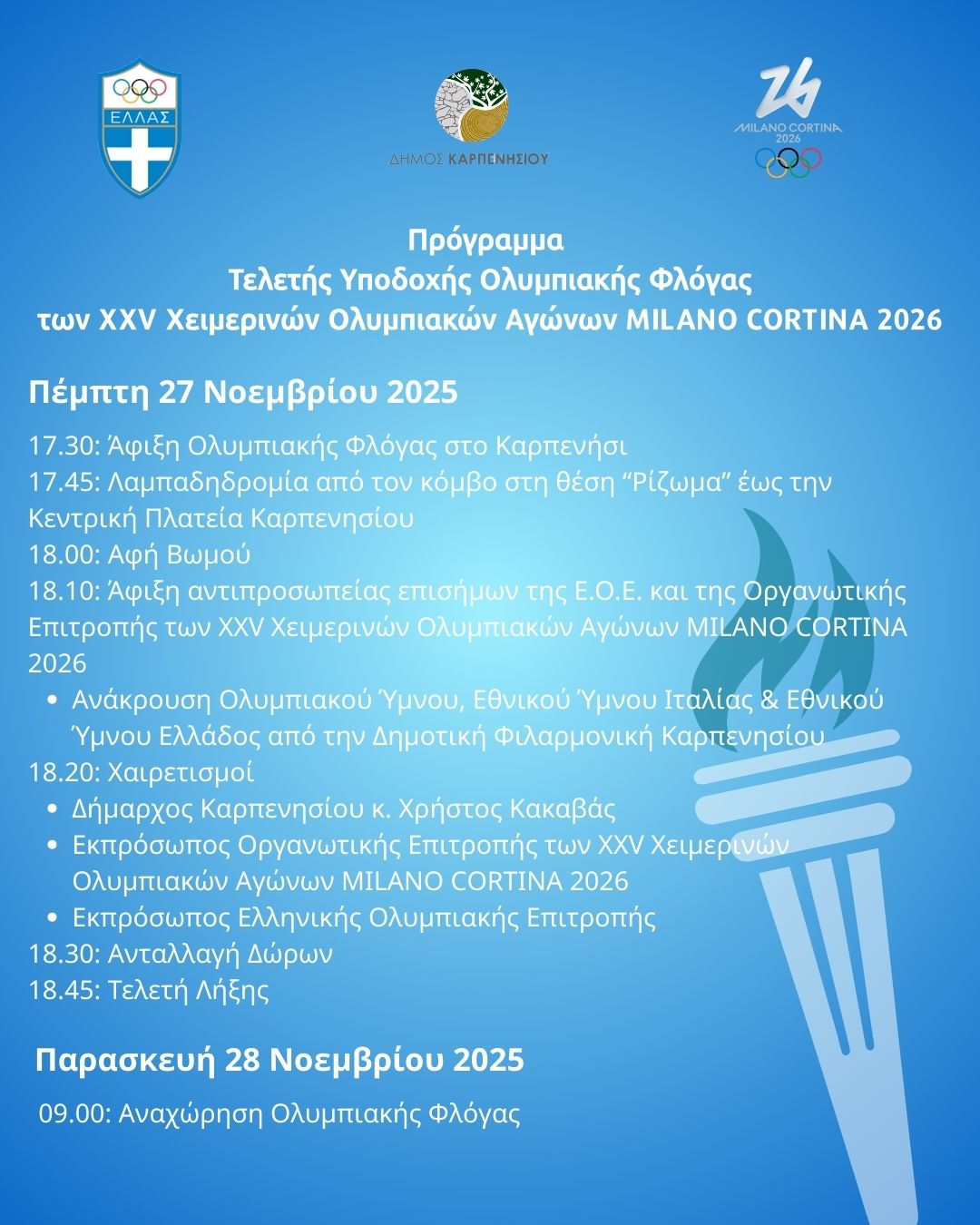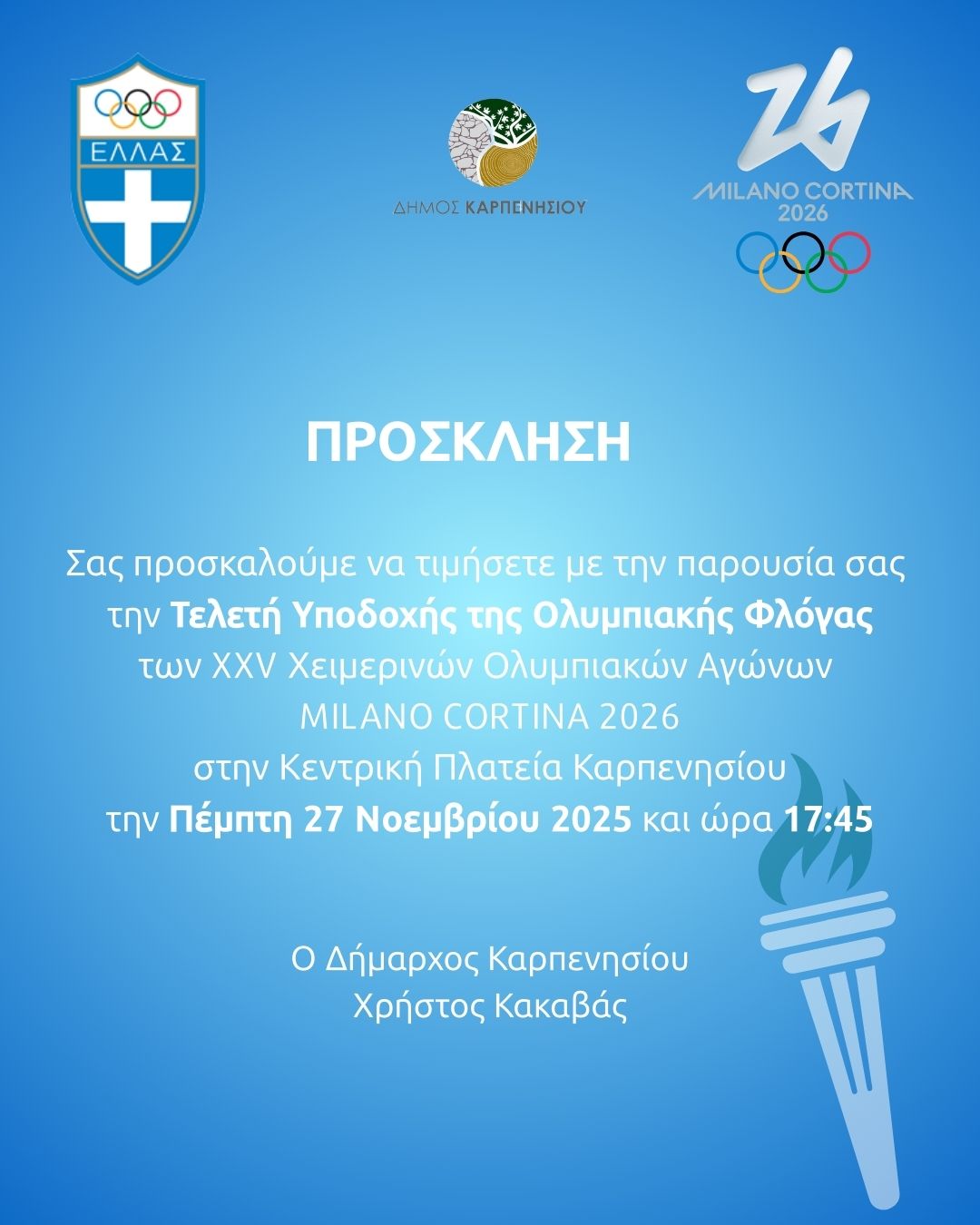 Ο Δήμος Καρπενησίου υποδέχεται την Ολυμπιακή Φλόγα στο πλαίσιο της Λαμπαδηδρομίας των XXV Χειμερινών Ολυμπιακών Αγώνων MILANO CORTINA 2026.