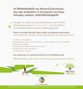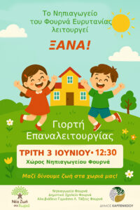 Την Τρίτη 3 Ιουνίου και ώρα 12:30 θα πραγματοποιηθεί παρουσία της Υπουργού Παιδείας κας Σοφίας Ζαχαράκη η τελετή επαναλειτουργίας του του Νηπιαγωγείου του Φουρνά Ευρυτανίας, που είχε ανασταλεί λόγω της έλλειψης παιδιών.